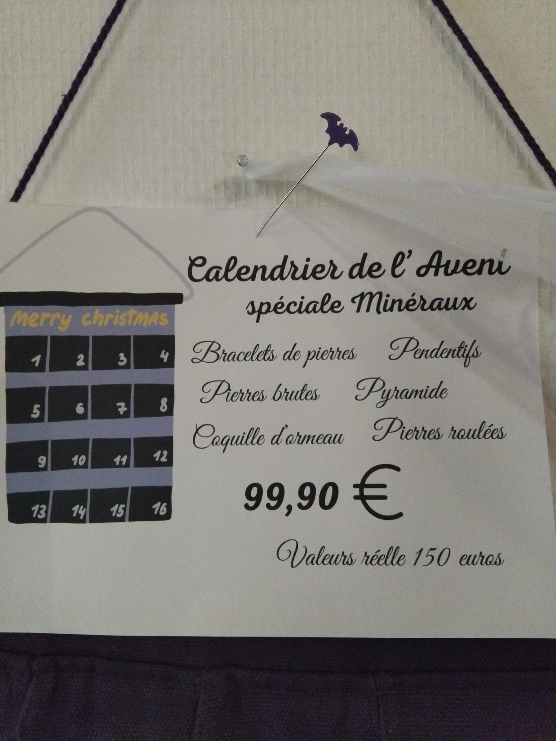 chaque jour du 1 au 24 décembre vous pourrez découvrir des bracelets, des pendentifs, des pierres brutes , une pyramide, des pierres roulées et une couille d’ormeau.