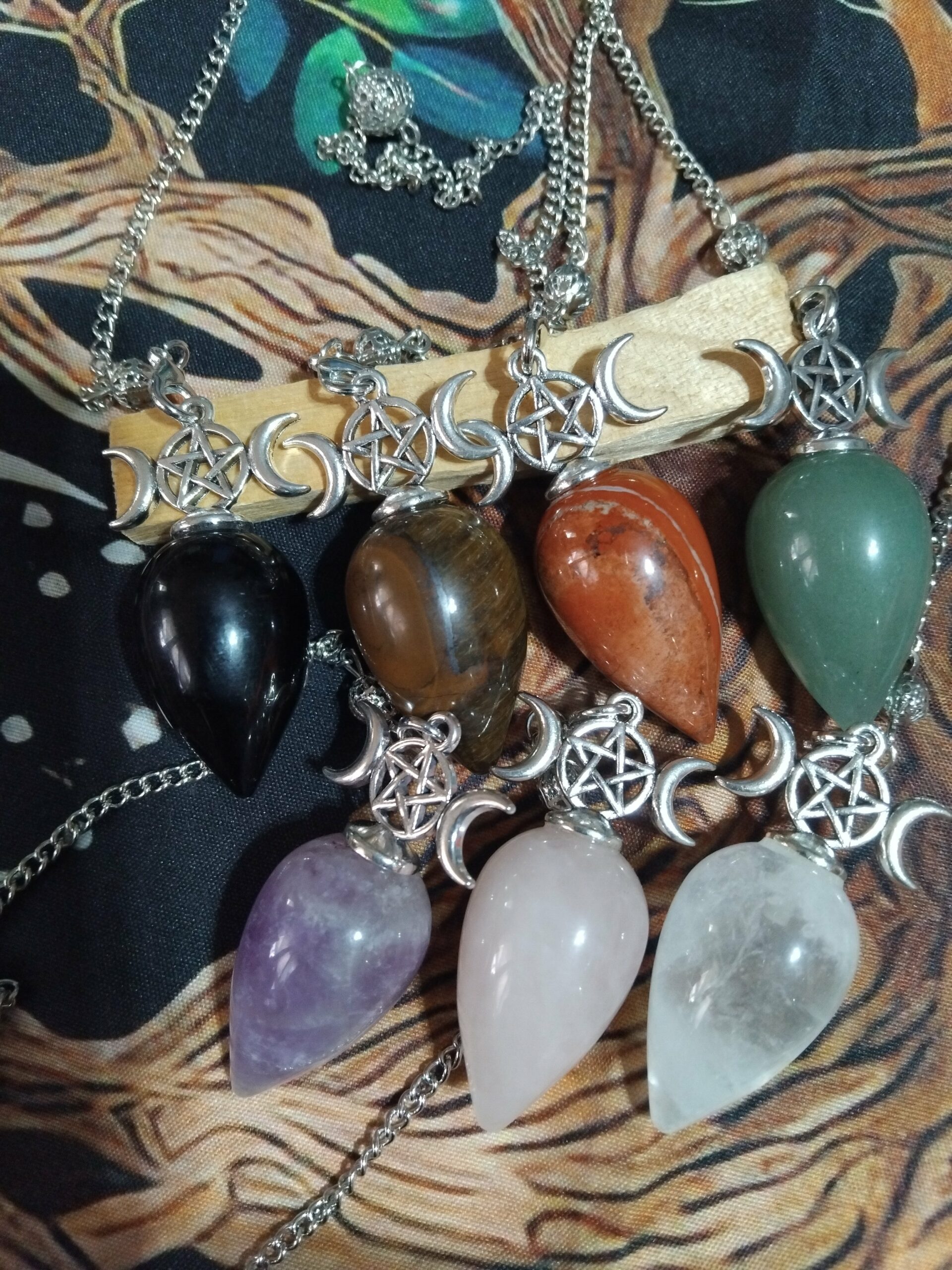 pendule en pierre surmonté d’une triple lune et d’un pentagrame de protection.
